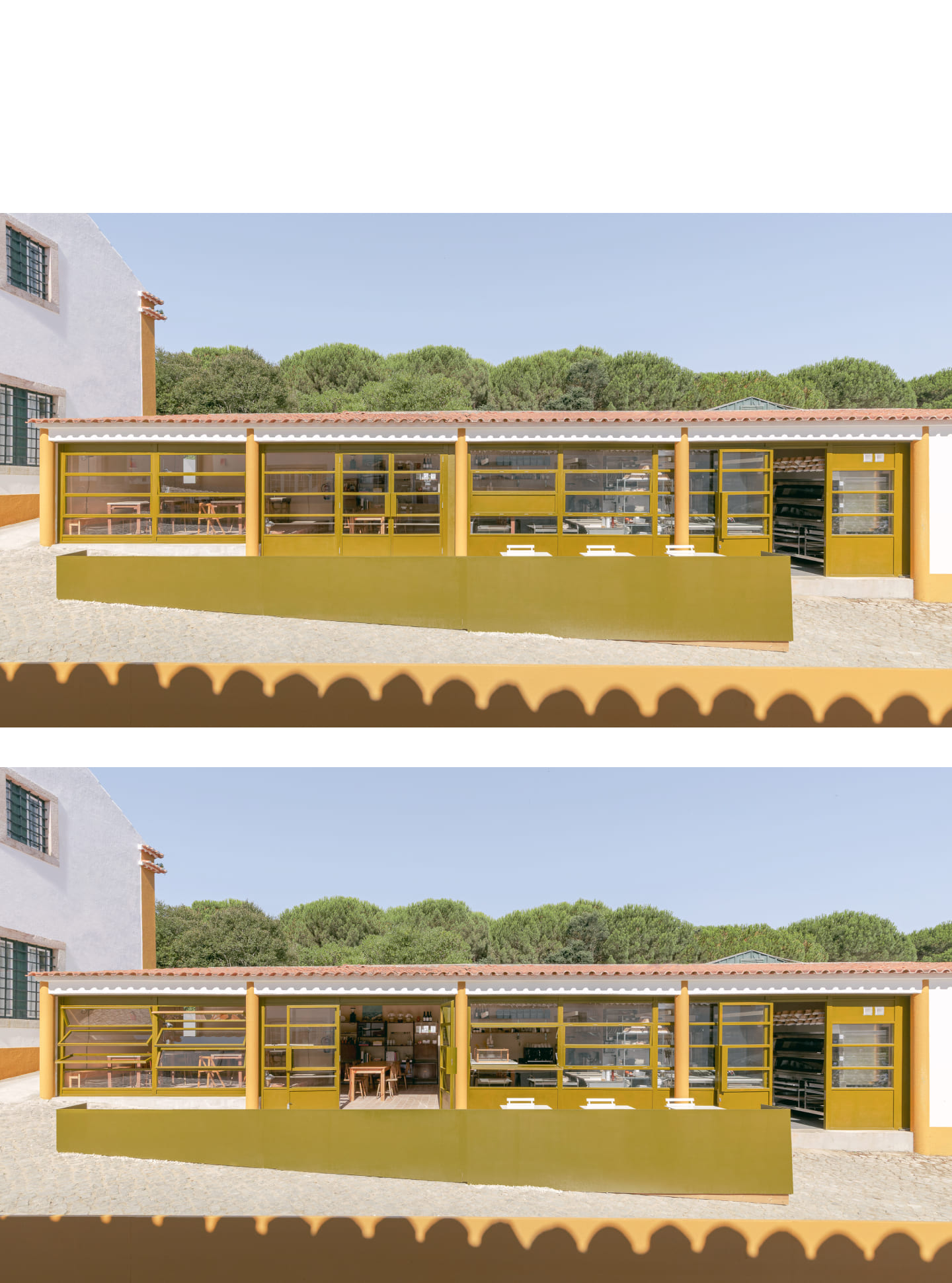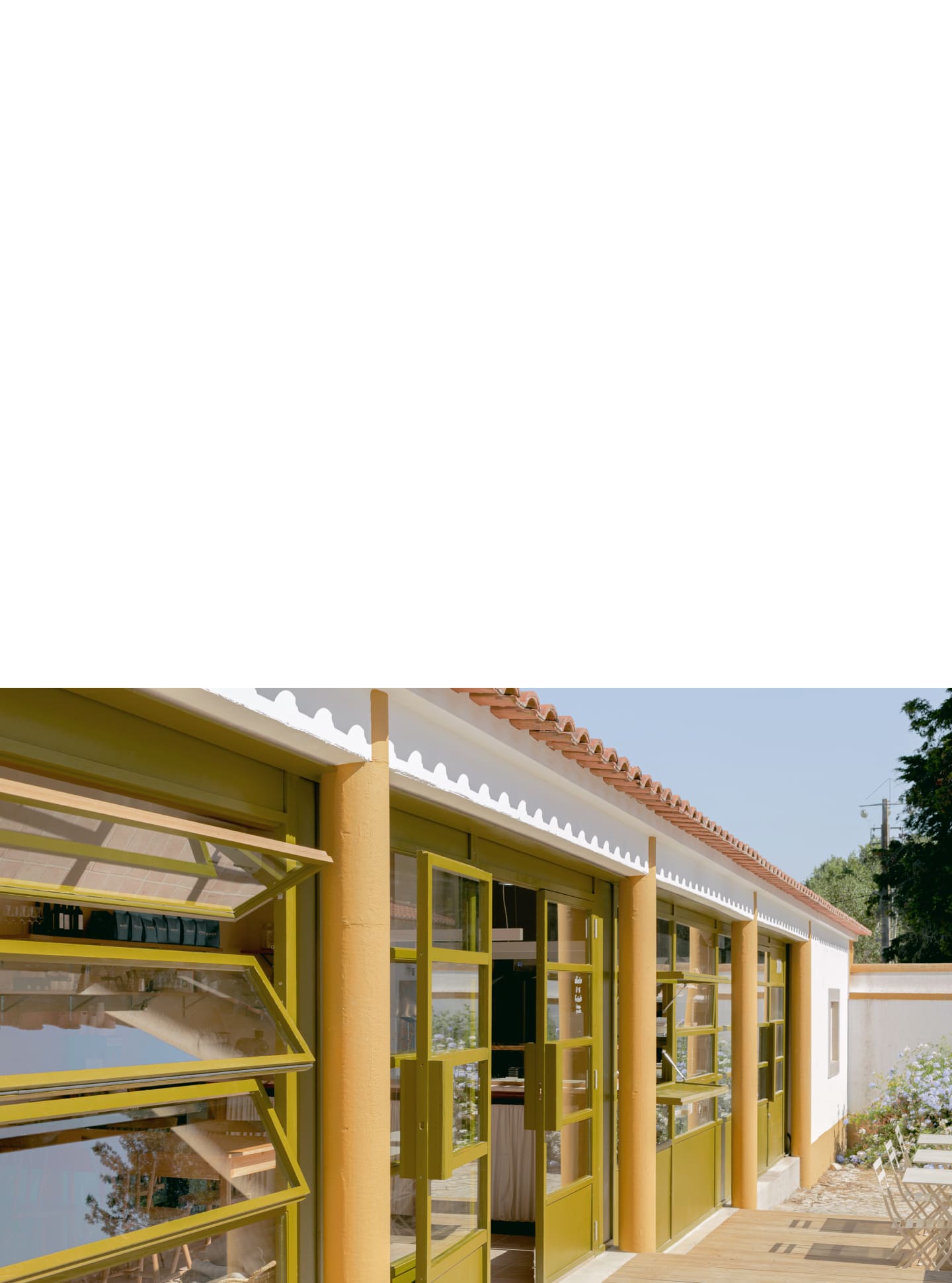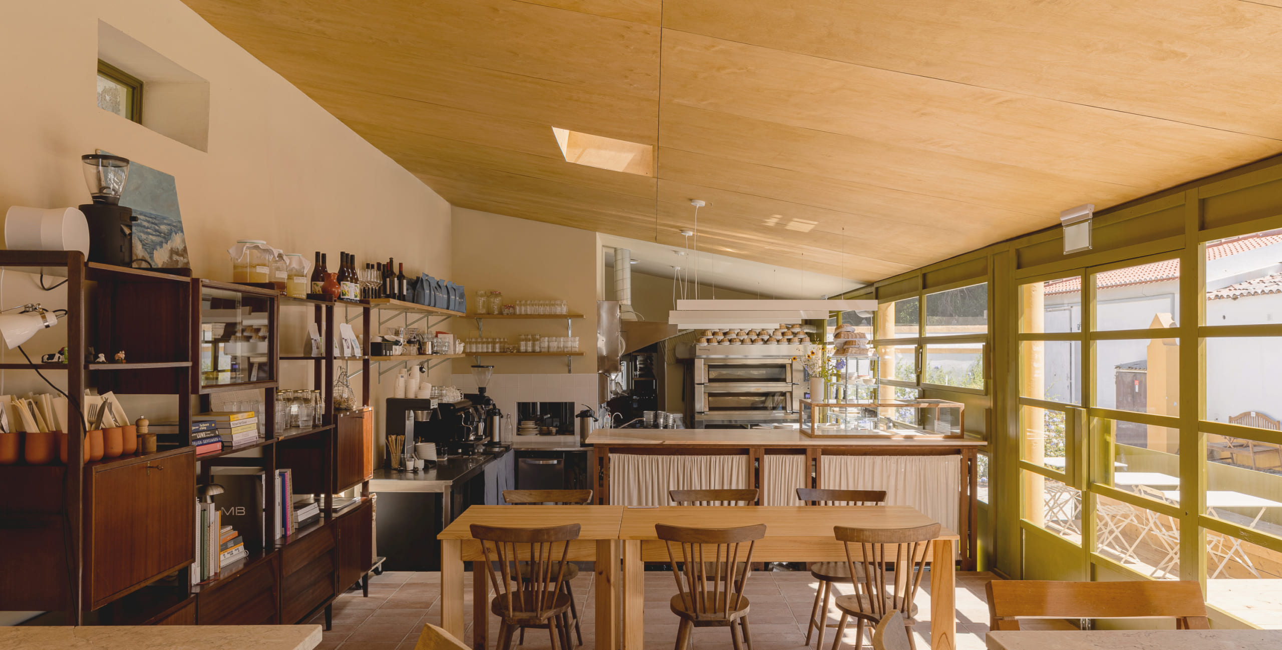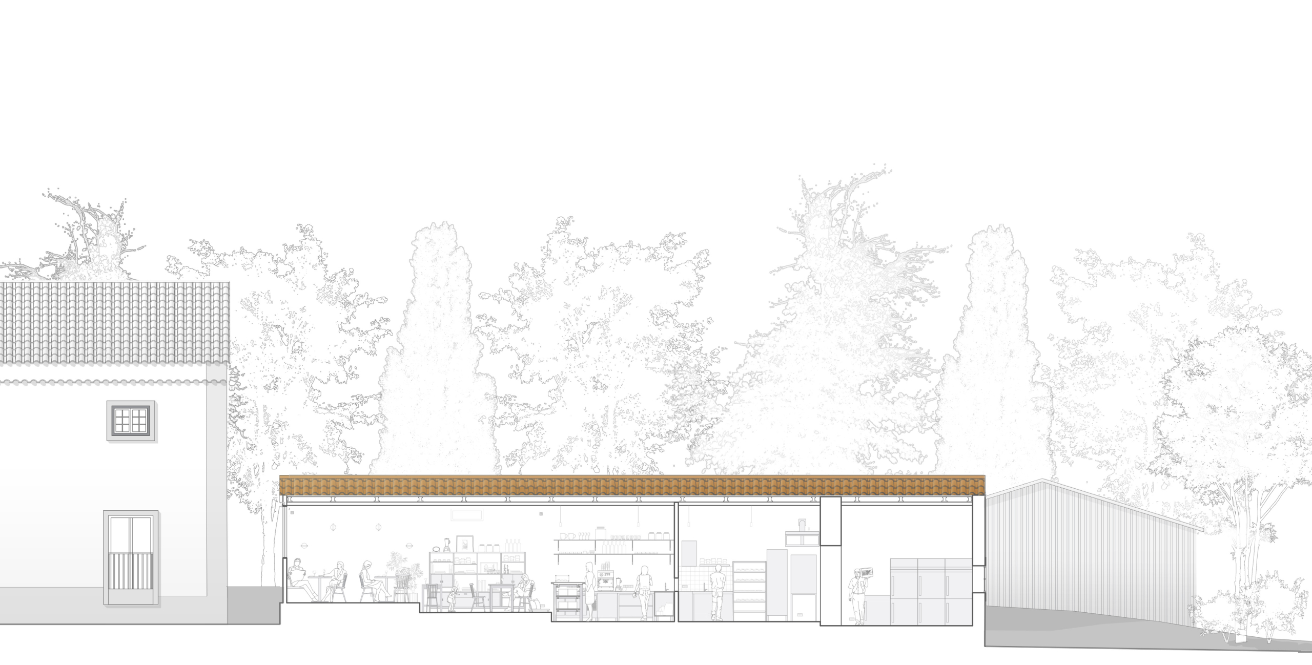 The bakery, realized as the first phase, exemplifies this approach. The new façade is realized as an independent and continuous timber structure, positioned behind the existing columns without touching them, articulating the building’s new function as something deliberately "inserted" into the old body of the structure. Its perforations offer multiple configurations of openness and closure, further articulating the independence of the new construction. The chosen palette acknowledges the quinta’s material character while asserting its contemporary identity through difference rather than mimicry. Inside, the plan is structured around an open kitchen, foregrounding the performative act of baking as both hospitality and craft.