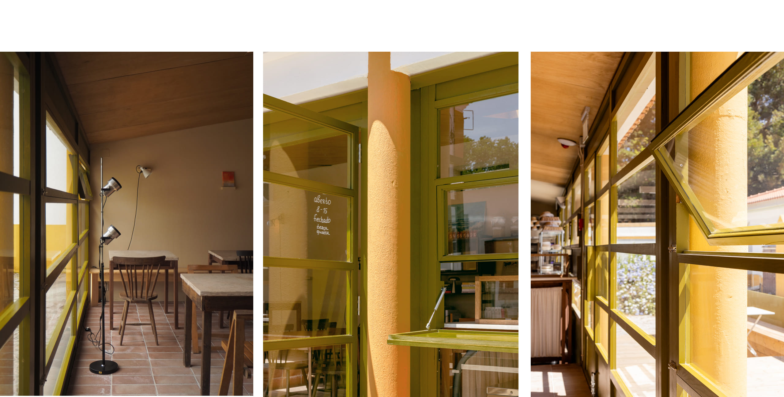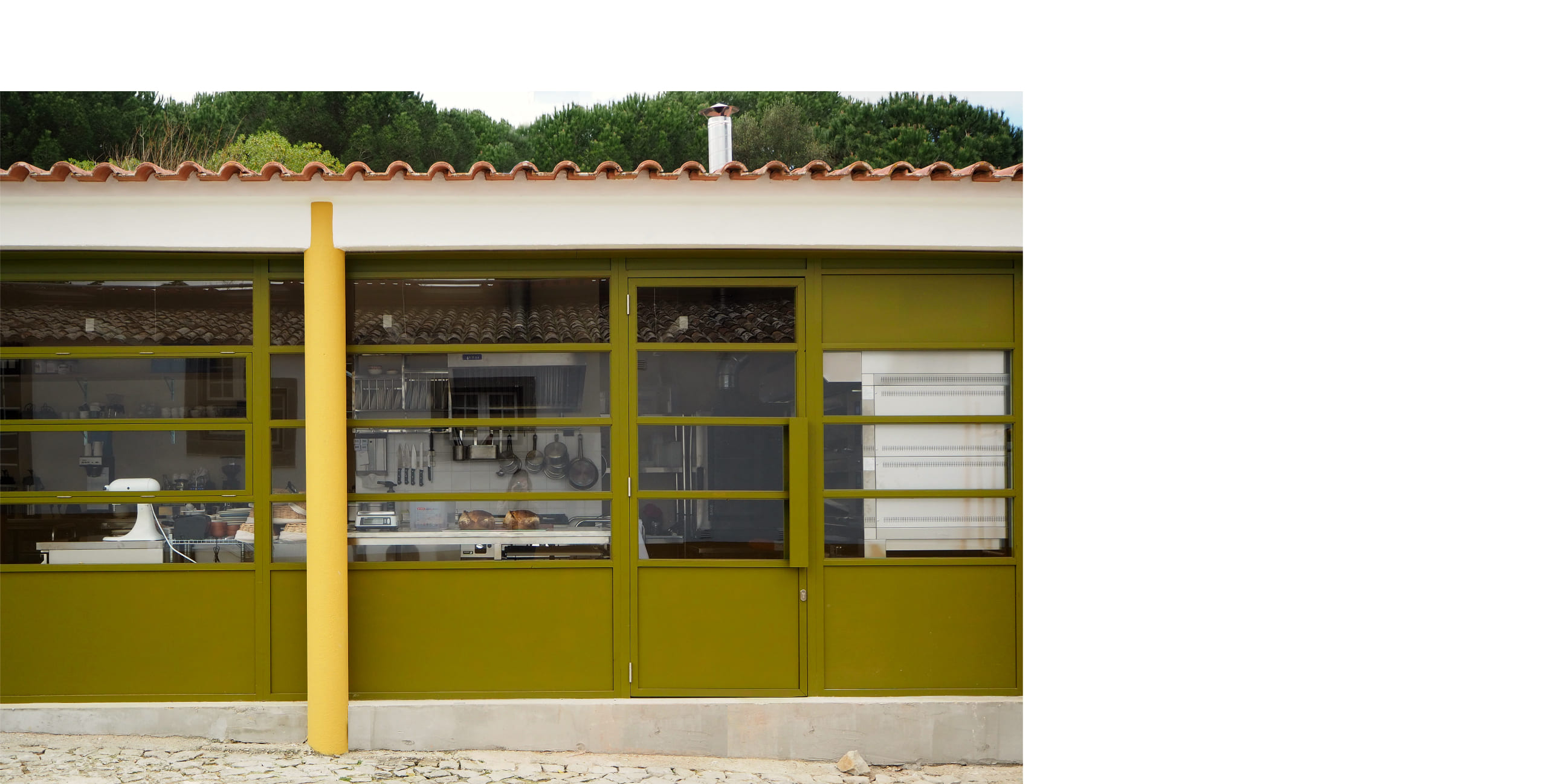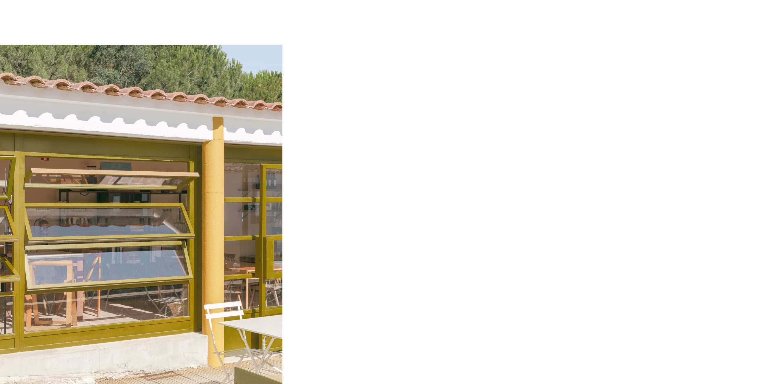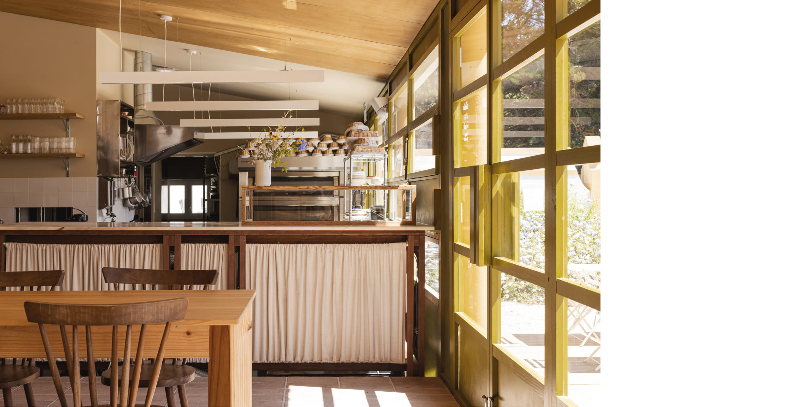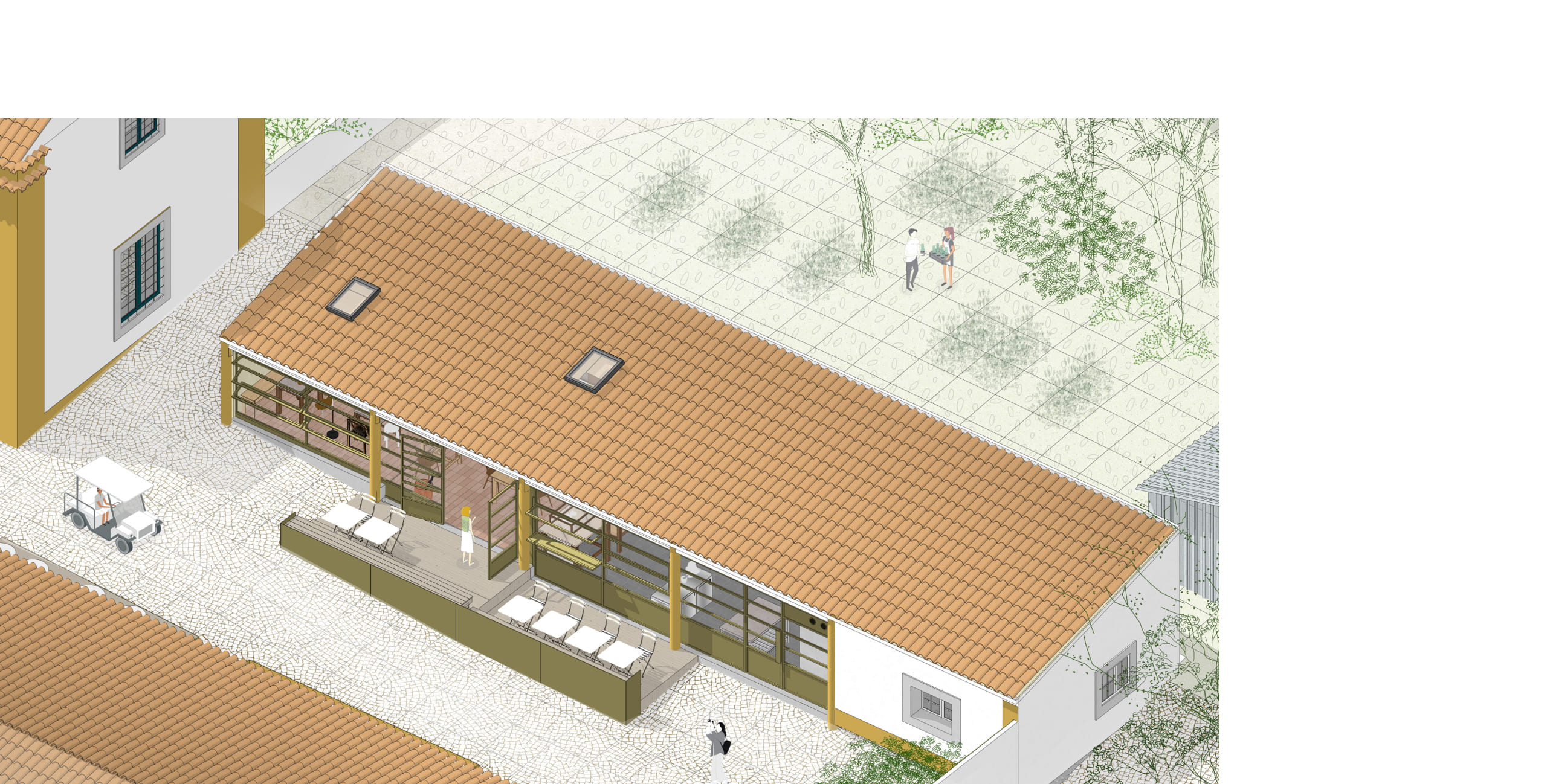 The bakery, realized as the first phase, exemplifies this approach. The new façade is realized as an independent and continuous timber structure, positioned behind the existing columns without touching them, articulating the building’s new function as something deliberately "inserted" into the old body of the structure. Its perforations offer multiple configurations of openness and closure, further articulating the independence of the new construction. The chosen palette acknowledges the quinta’s material character while asserting its contemporary identity through difference rather than mimicry. Inside, the plan is structured around an open kitchen, foregrounding the performative act of baking as both hospitality and craft.