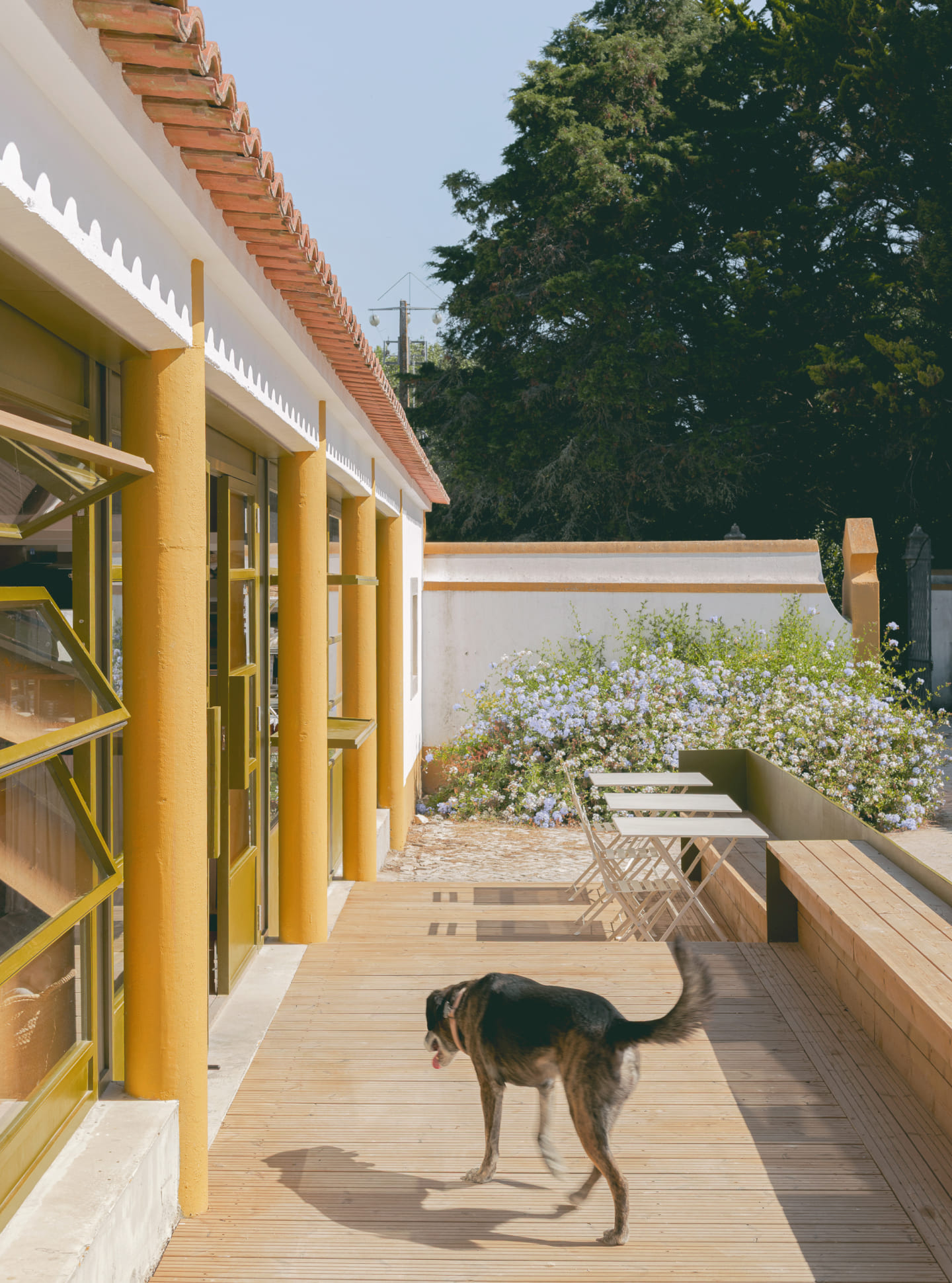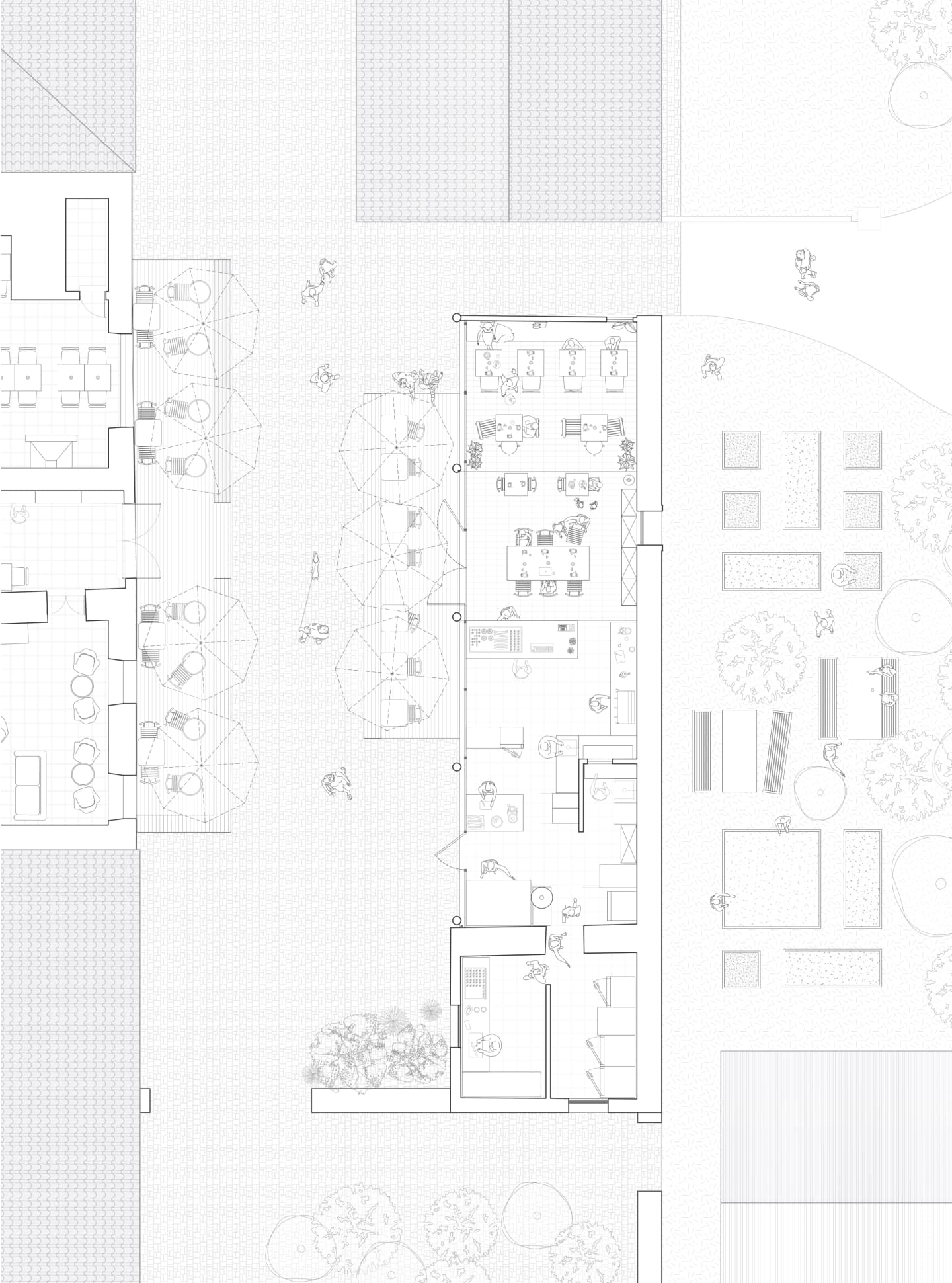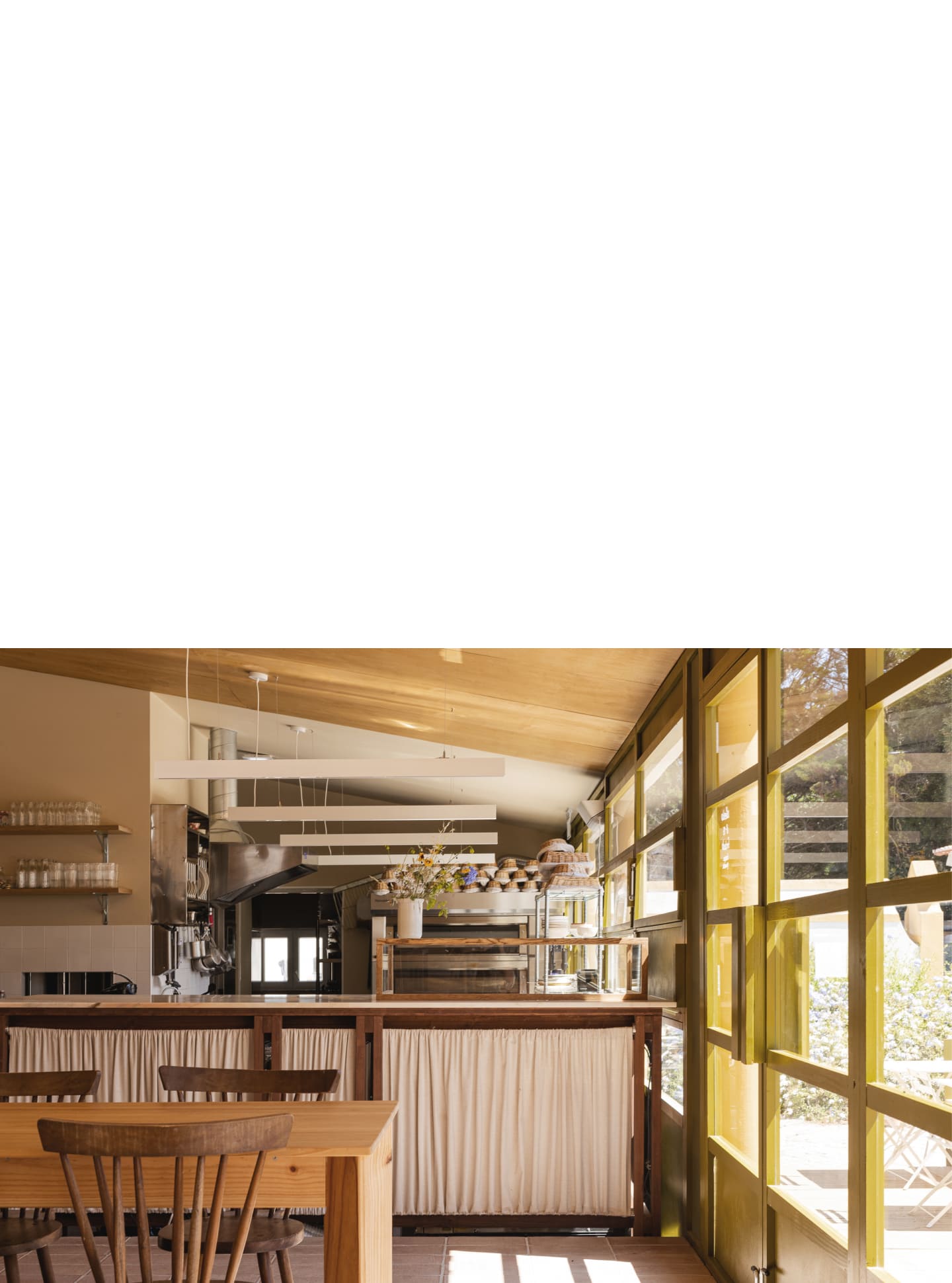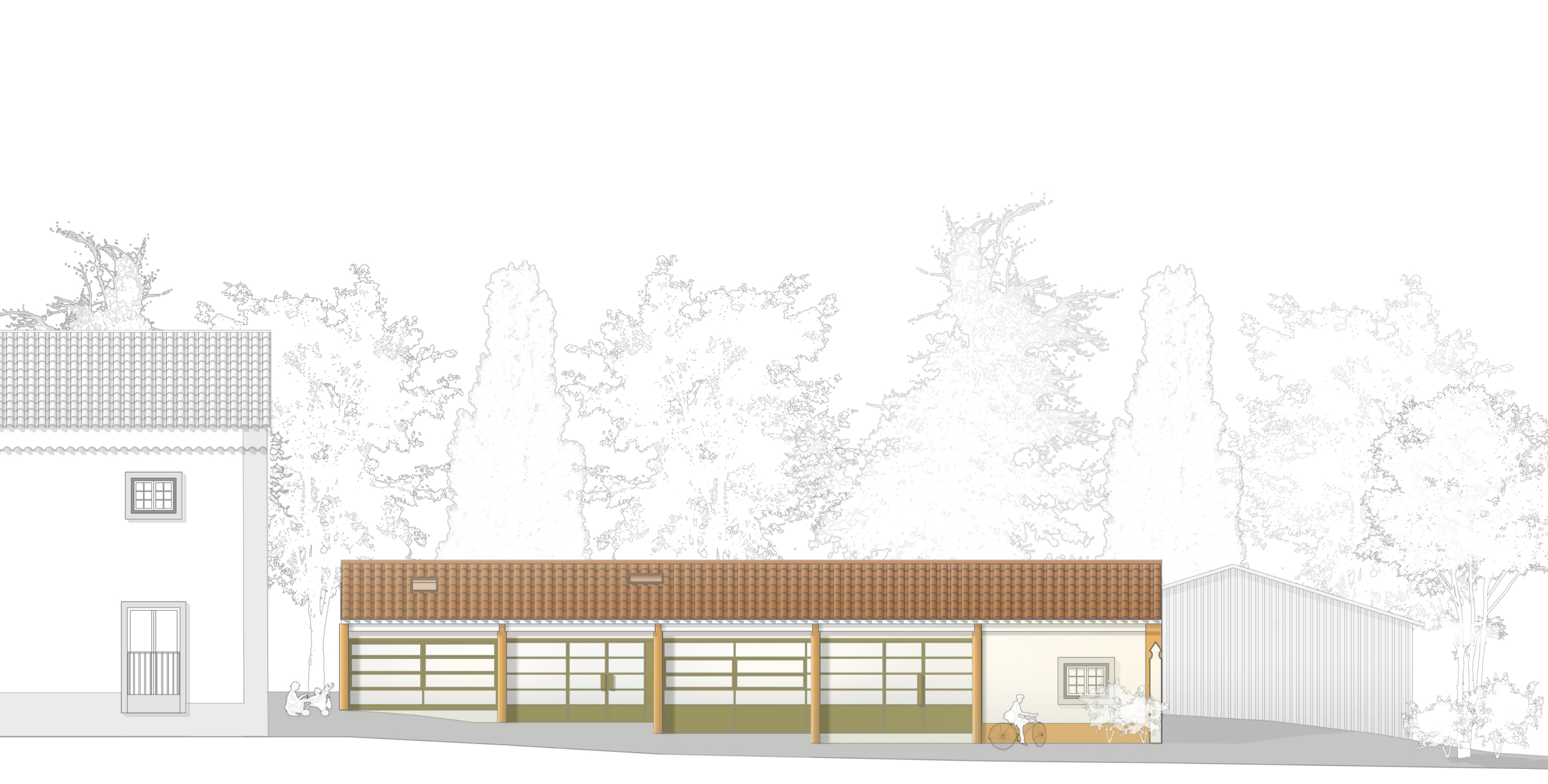 The bakery, realized as the first phase, exemplifies this approach. The new façade is realized as an independent and continuous timber structure, positioned behind the existing columns without touching them, articulating the building’s new function as something deliberately "inserted" into the old body of the structure. Its perforations offer multiple configurations of openness and closure, further articulating the independence of the new construction. The chosen palette acknowledges the quinta’s material character while asserting its contemporary identity through difference rather than mimicry. Inside, the plan is structured around an open kitchen, foregrounding the performative act of baking as both hospitality and craft.