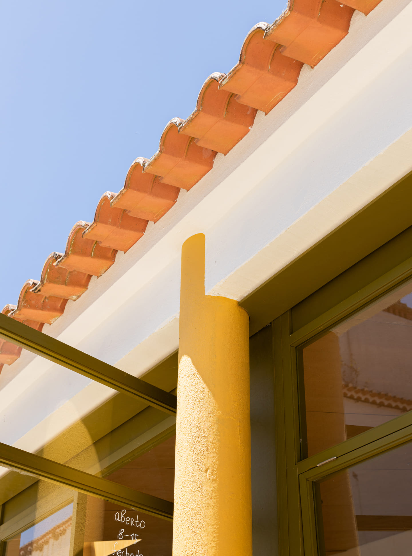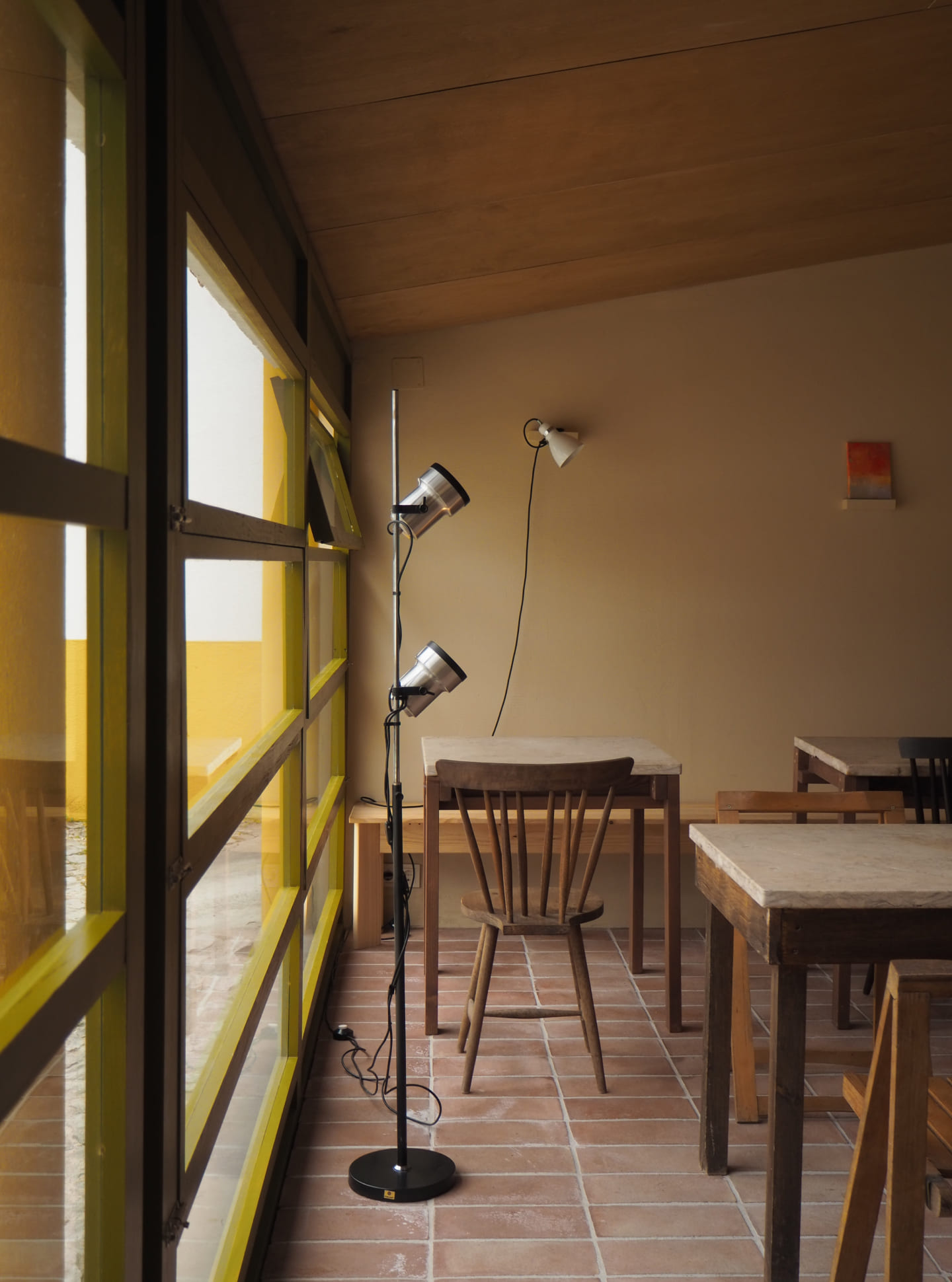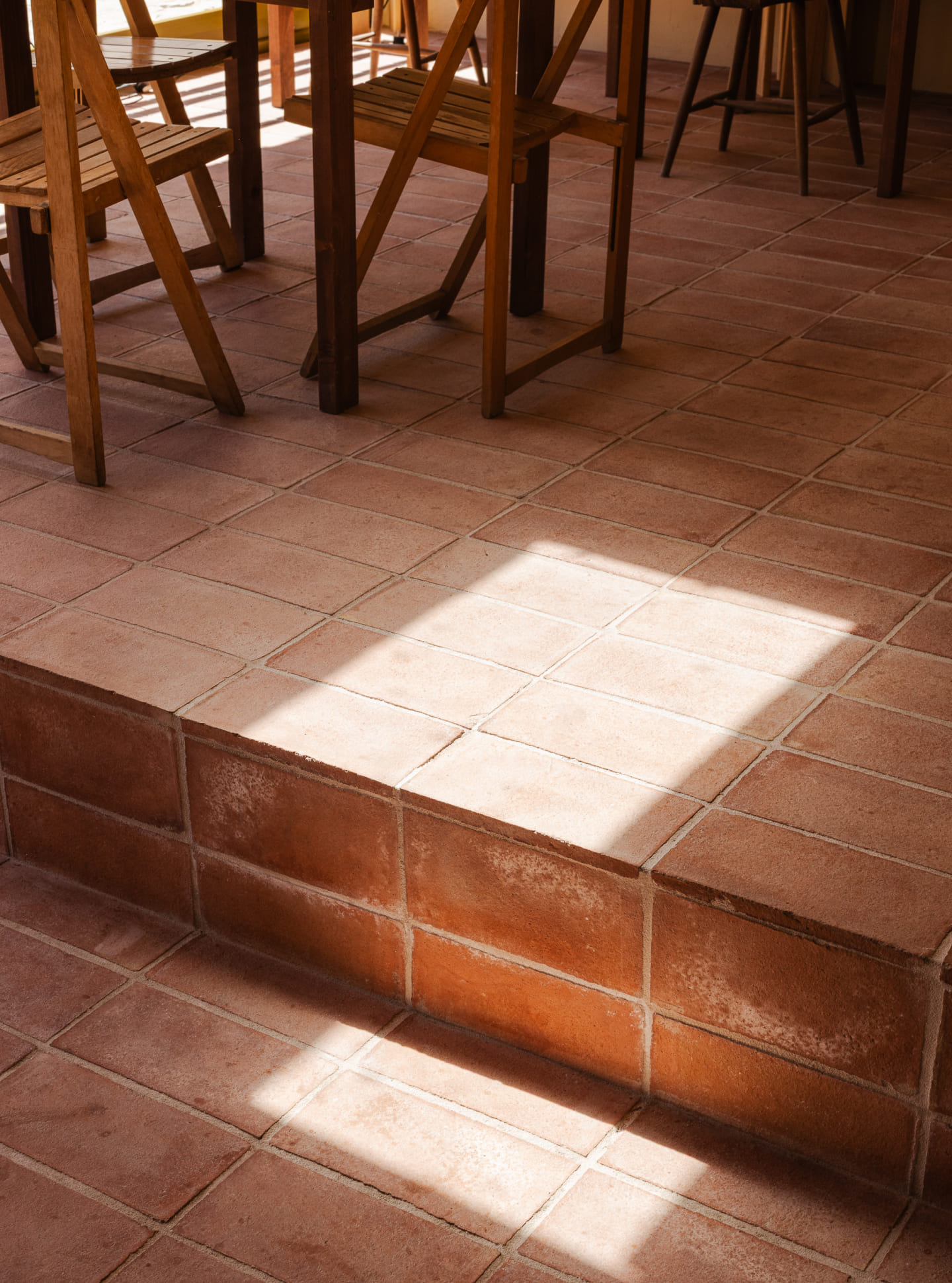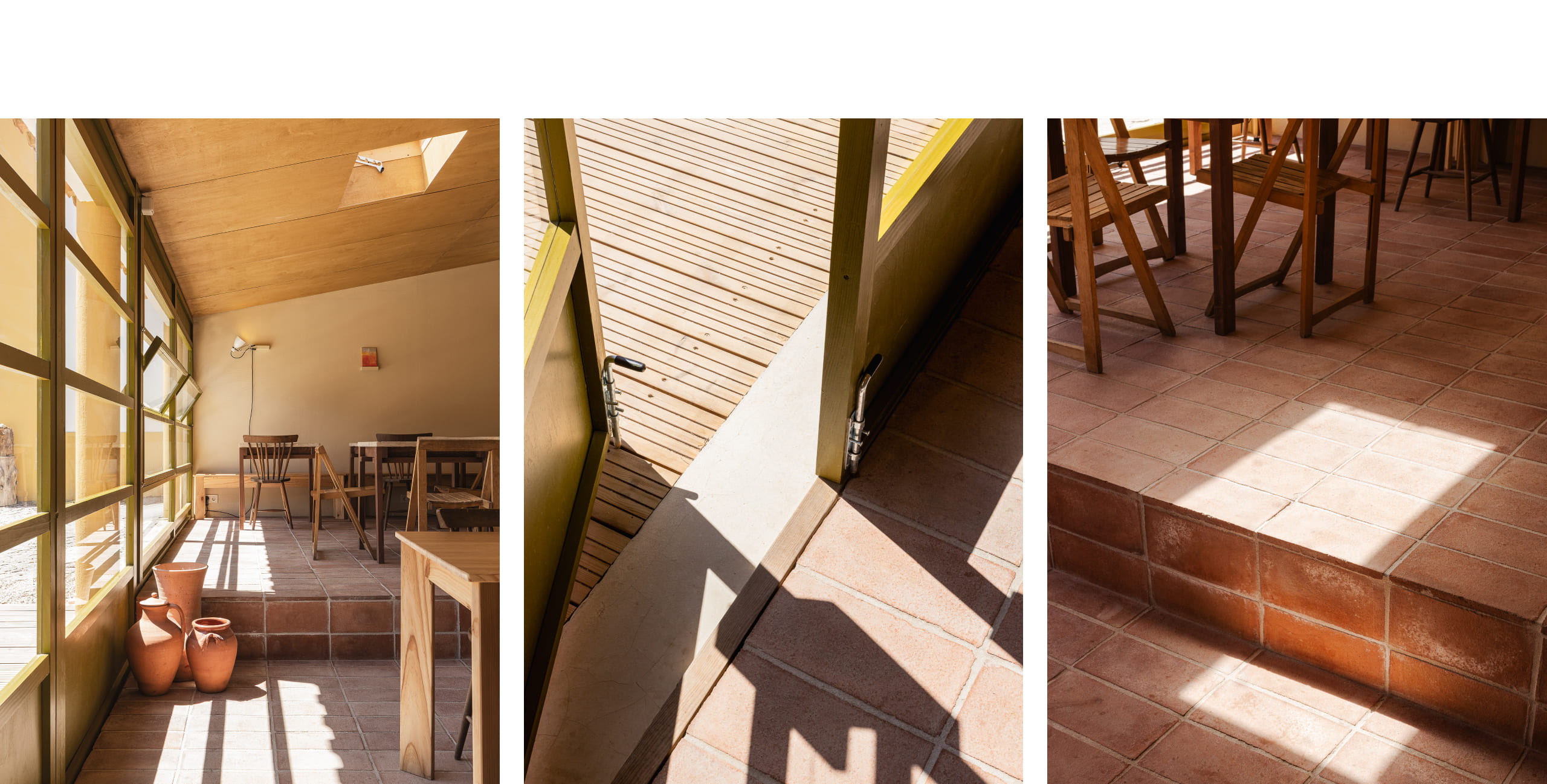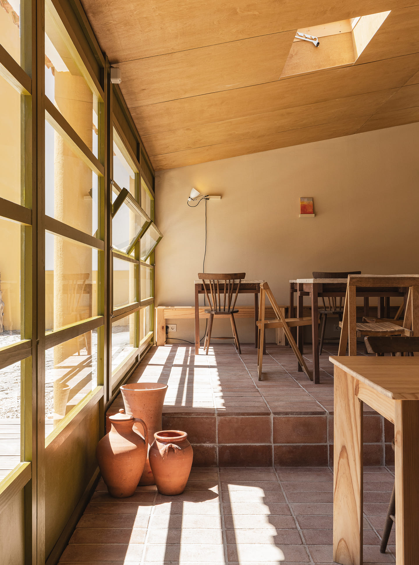 The interior articulates a dialogue between Nordic restraint and Portuguese material traditions. Handmade terracotta tiles, sourced locally, meet countertops of mármore de Luís – stone recovered from the site itself. Furniture combines disparate genealogies: existing pieces, rabo de bacalhau chairs, re-editions of Olaio’s folding designs, and a shelving unit from the same manufacturer reintroduced into daily use.
